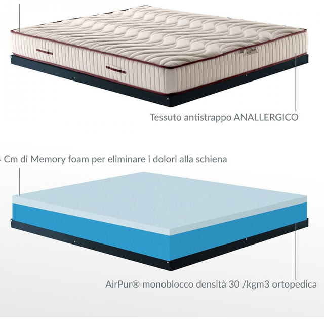 Memory Gaia a base vegetale e Memory UHD ultra denso. Il comfort e l’ergonomia sono al massimo delle prestazioni, riesce a seguire nel dettaglio la conformazione corporea prendendo la forma del corpo e permettendo la traspirazione.